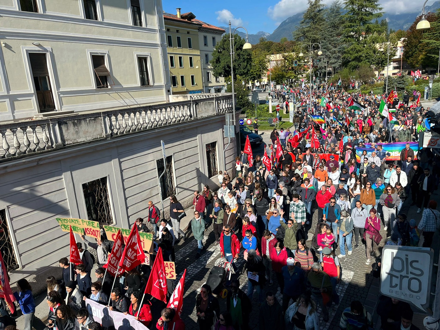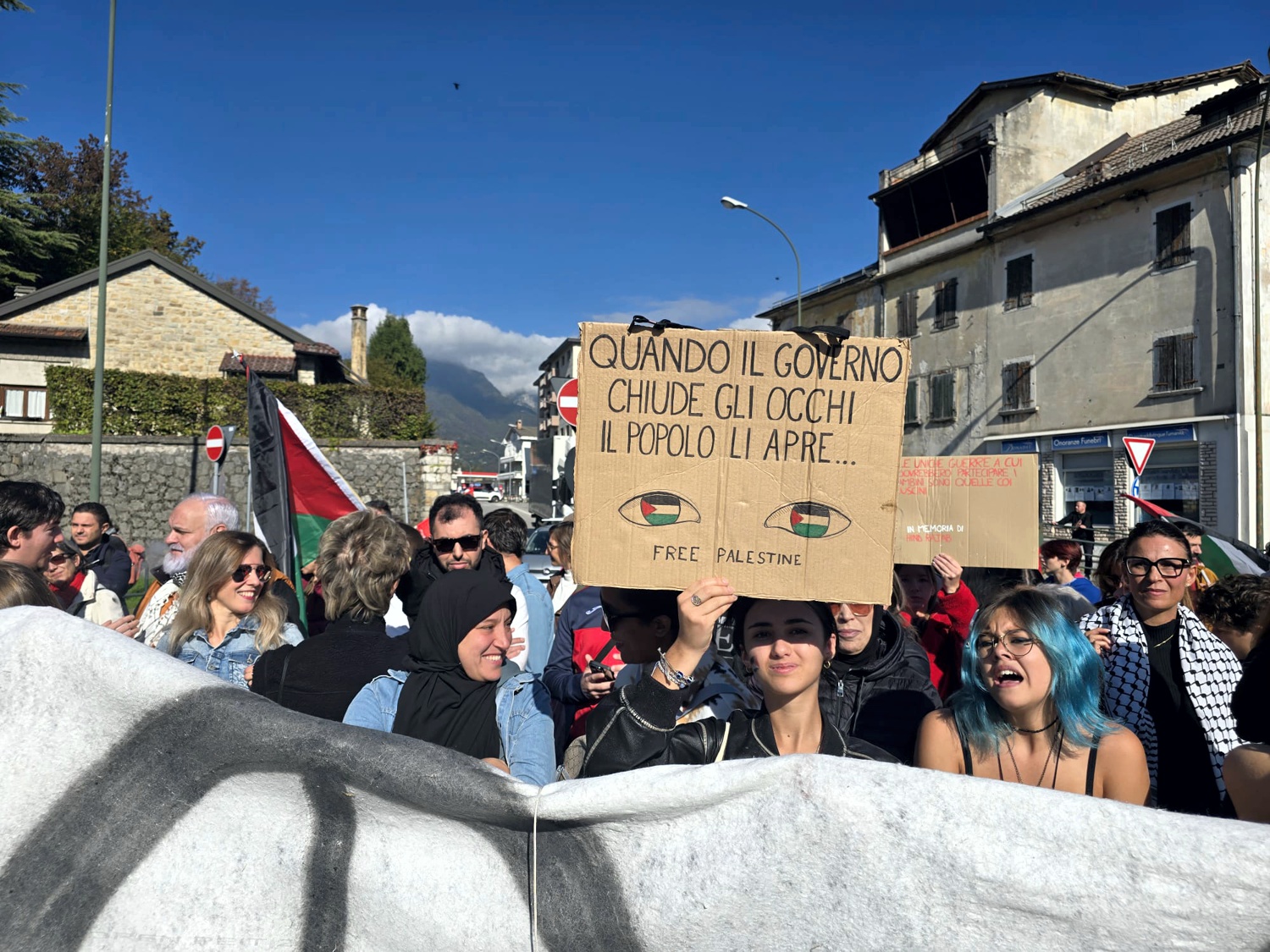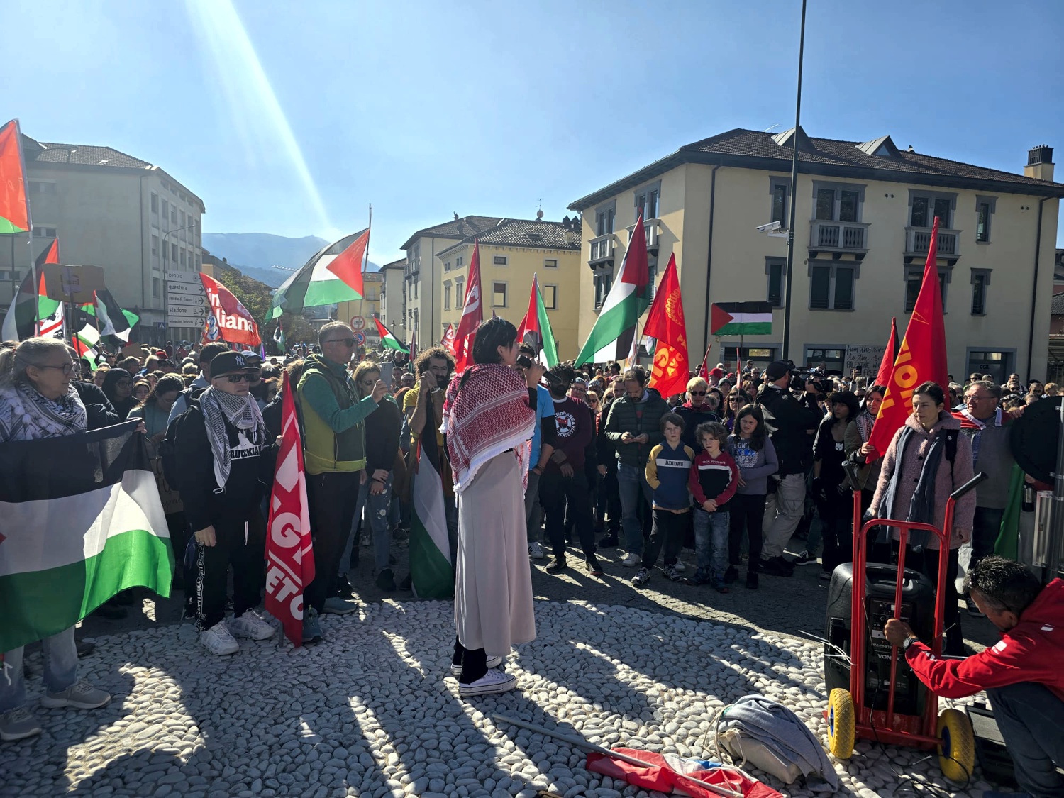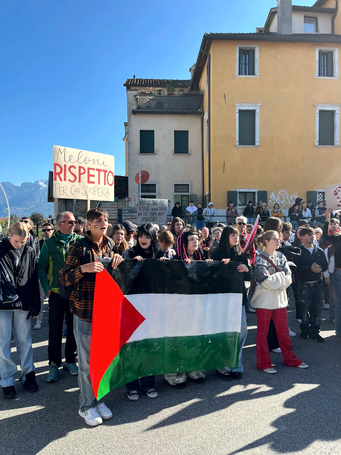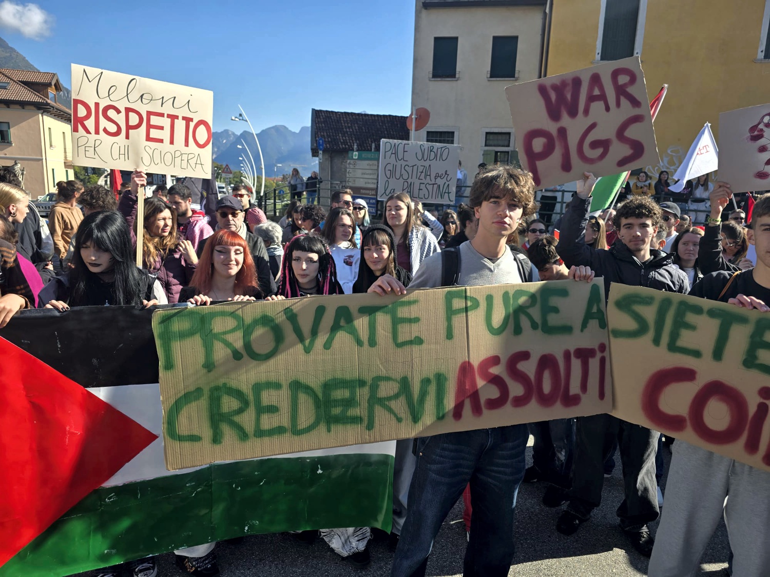 A Belluno almeno duemila persone tra studenti, lavoratori e pensionati hanno marciato per chiedere la pace a Gaza. Una marea di persone che ha riempito tutta Piazza dei Martiri. I manifestanti si sono ritrovati stamattina, venerdì 3 ottobre, alla rotonda della Cerva per partecipare allo sciopero generale indetto da Flc– Cgil e S.i. Cobas in segno di protesta contro il blocco della missione umanitaria della Global Sumund Flotilla per Gaza. L'appuntamento era previsto per le 10 ma molti si sono presentati sul posto prestabilito con minuti di anticipo muniti di cartelli di protesta, bandiere palestinesi e fumogeni. Dalla rotonda della Cerva sono partiti cori pro Palestina, canzoni inneggianti la libertà e invettive contro il governo Meloni, contro il ministro Salvini e contro il governo israeliano. Dal punto di ritrovo i manifestanti si sono avviati verso il centro storico attraversando viale Fantuzzi, proseguendo lungo via Girolamo Segato per poi imboccare via Loreto e giungere nel centro cittadino. Una volta giunto in Piazza dei Martiri, il corteo ha percorso metà Liston prima di depositare a terra una bandiera palestinese e una bandiera della pace. I manifestanti si sono chiusi a cerchio impugnando uno striscione che invocava lo stop al genocidio palestinese ed hanno ascoltato le parole di diversi rappresentanti sindacali, politici ed insegnanti. Gli interventi degli interlocutori venivano spesso interrotti da cori e canti che inneggiavano alla libertà per la Palestina. Il tutto è avvenuto in clima sereno e disteso, dove diversi oratori hanno potuto parlare ed esporre le rispettive motivazioni alla base dell'adesione allo sciopero. Rumori, suoni e colori hanno attirato anche tanti curiosi che, seppur inizialmente non avevano partecipato allo sciopero, hanno iniziato a cantare e ascoltare con interesse le motivazioni e i discorsi pro Gaza dei manifestanti.