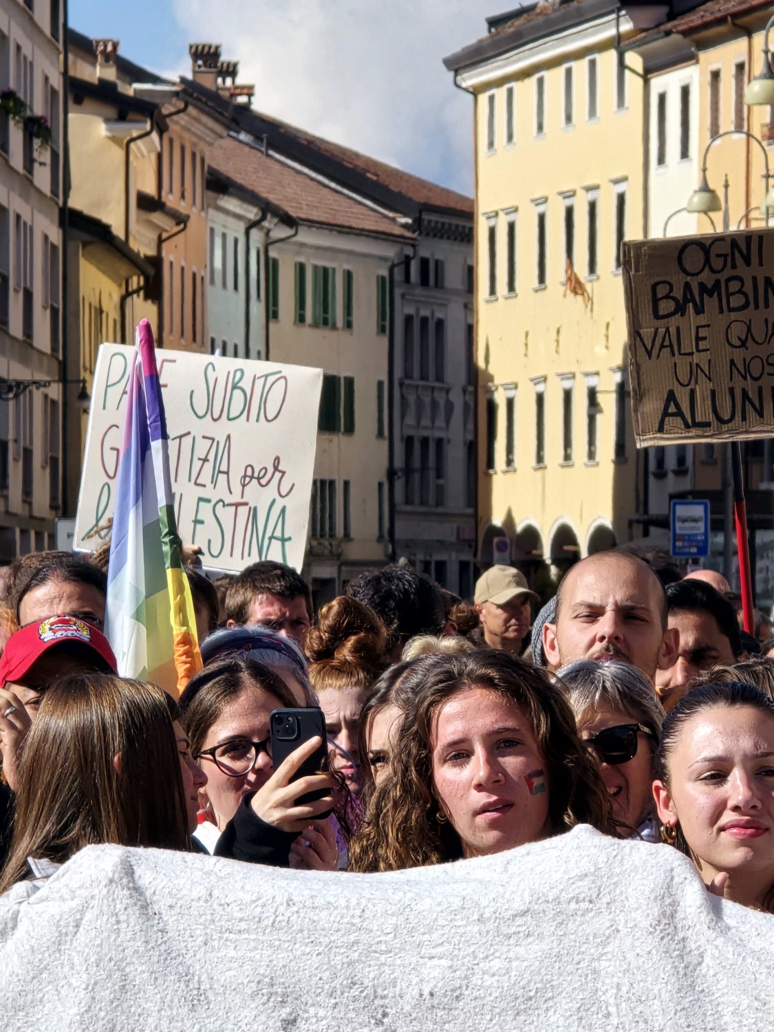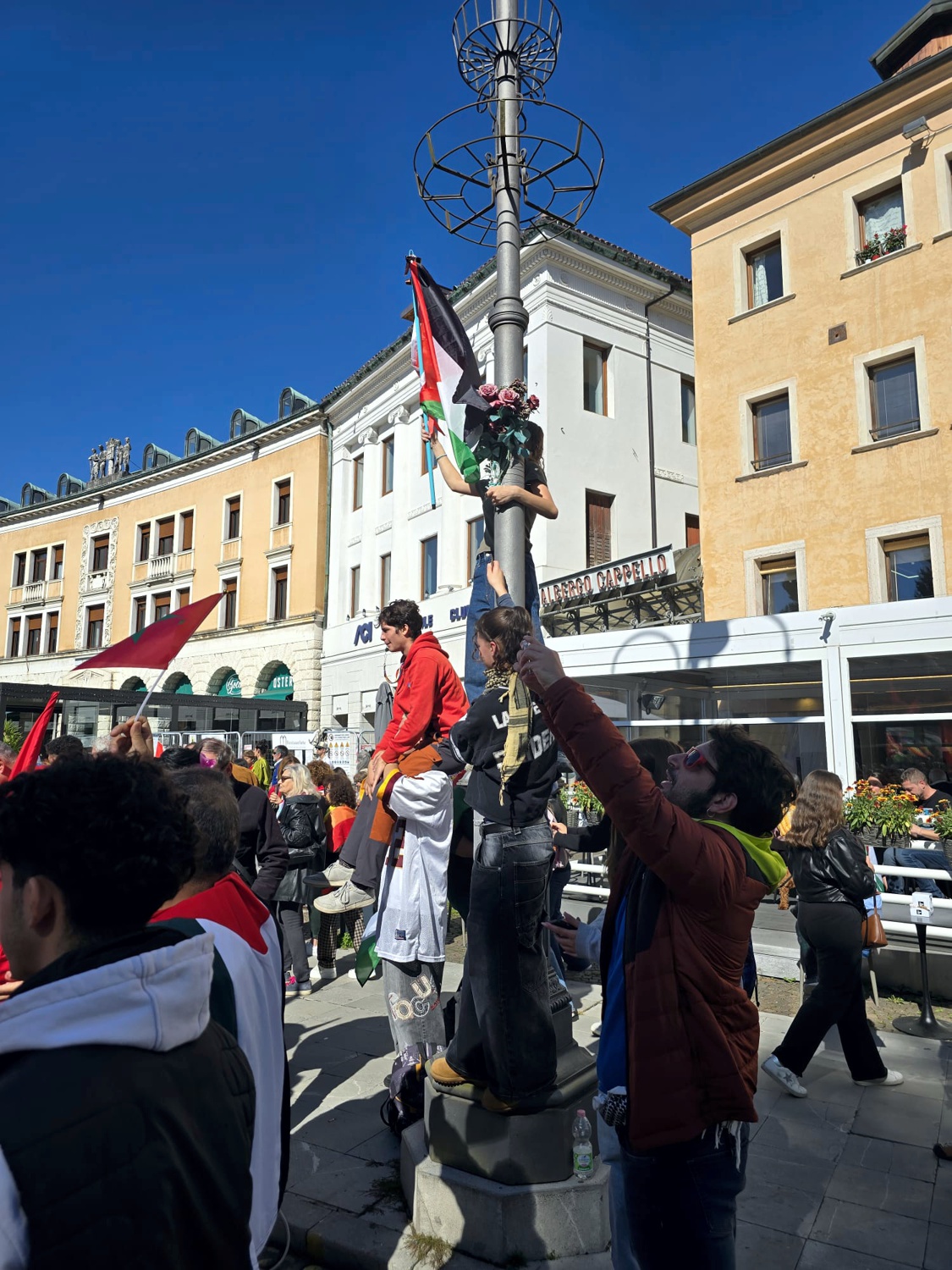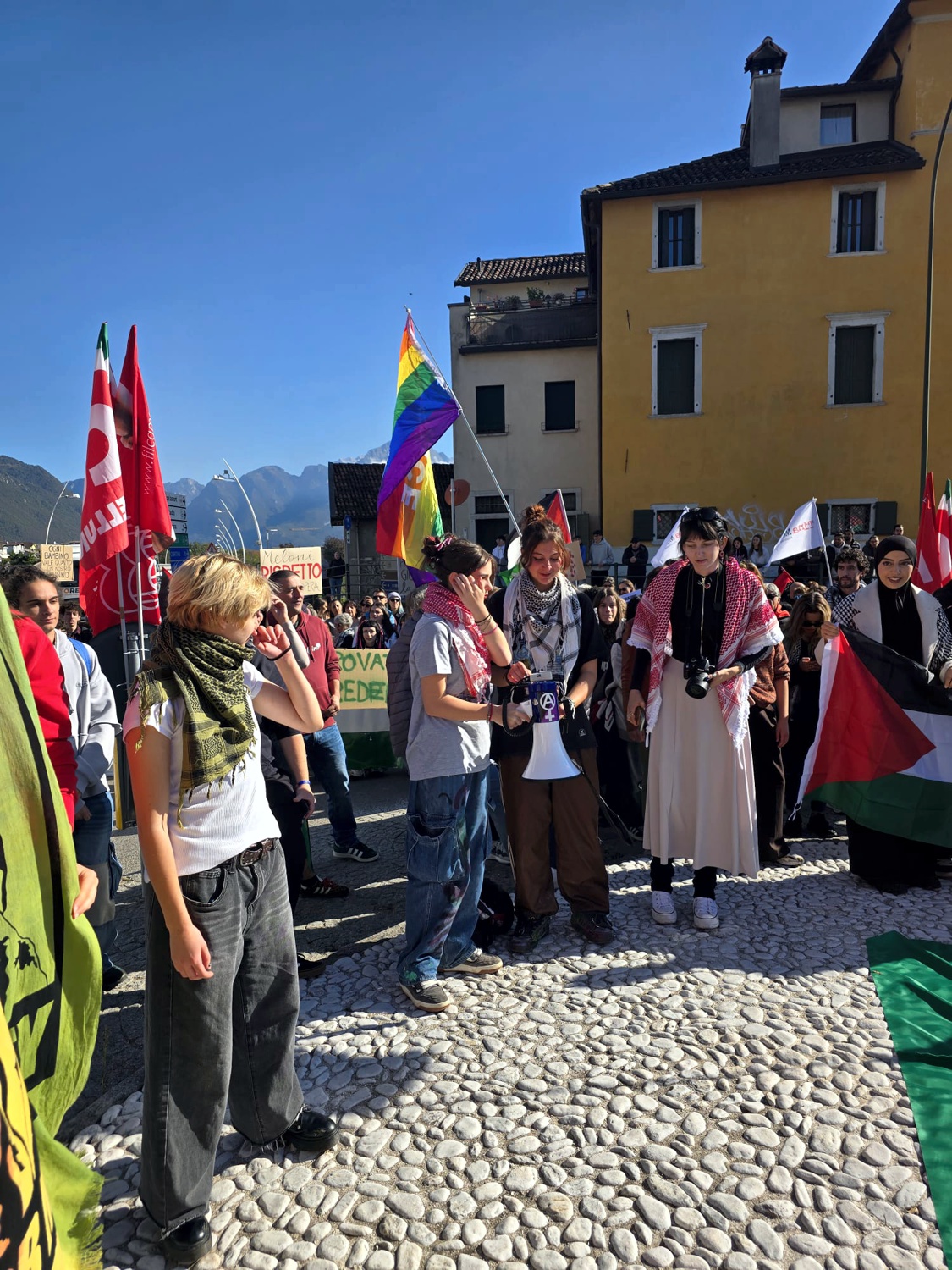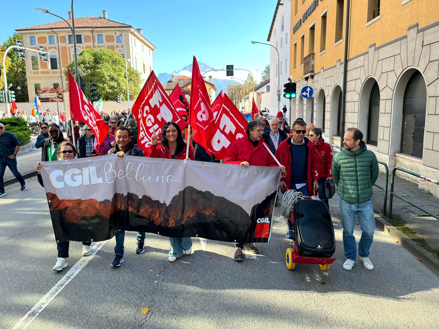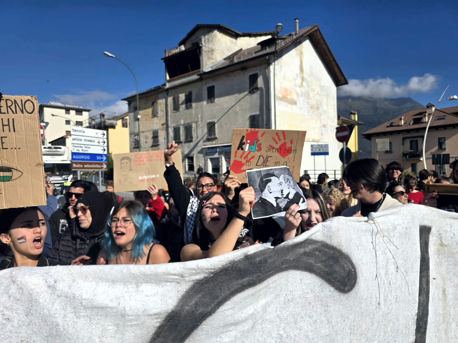 A Belluno almeno duemila persone tra studenti, lavoratori e pensionati hanno marciato per chiedere la pace a Gaza. Una marea di persone che ha riempito tutta Piazza dei Martiri. I manifestanti si sono ritrovati stamattina, venerdì 3 ottobre, alla rotonda della Cerva per partecipare allo sciopero generale indetto da Flc– Cgil e S.i. Cobas in segno di protesta contro il blocco della missione umanitaria della Global Sumund Flotilla per Gaza. L'appuntamento era previsto per le 10 ma molti si sono presentati sul posto prestabilito con minuti di anticipo muniti di cartelli di protesta, bandiere palestinesi e fumogeni. Dalla rotonda della Cerva sono partiti cori pro Palestina, canzoni inneggianti la libertà e invettive contro il governo Meloni, contro il ministro Salvini e contro il governo israeliano. Dal punto di ritrovo i manifestanti si sono avviati verso il centro storico attraversando viale Fantuzzi, proseguendo lungo via Girolamo Segato per poi imboccare via Loreto e giungere nel centro cittadino. Una volta giunto in Piazza dei Martiri, il corteo ha percorso metà Liston prima di depositare a terra una bandiera palestinese e una bandiera della pace. I manifestanti si sono chiusi a cerchio impugnando uno striscione che invocava lo stop al genocidio palestinese ed hanno ascoltato le parole di diversi rappresentanti sindacali, politici ed insegnanti. Gli interventi degli interlocutori venivano spesso interrotti da cori e canti che inneggiavano alla libertà per la Palestina. Il tutto è avvenuto in clima sereno e disteso, dove diversi oratori hanno potuto parlare ed esporre le rispettive motivazioni alla base dell'adesione allo sciopero. Rumori, suoni e colori hanno attirato anche tanti curiosi che, seppur inizialmente non avevano partecipato allo sciopero, hanno iniziato a cantare e ascoltare con interesse le motivazioni e i discorsi pro Gaza dei manifestanti.