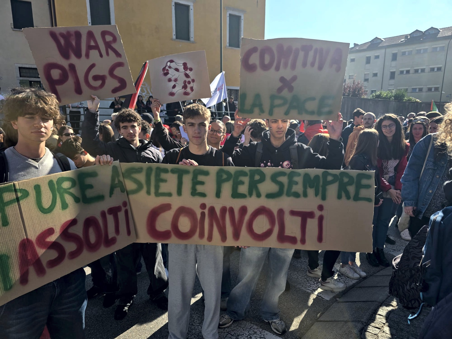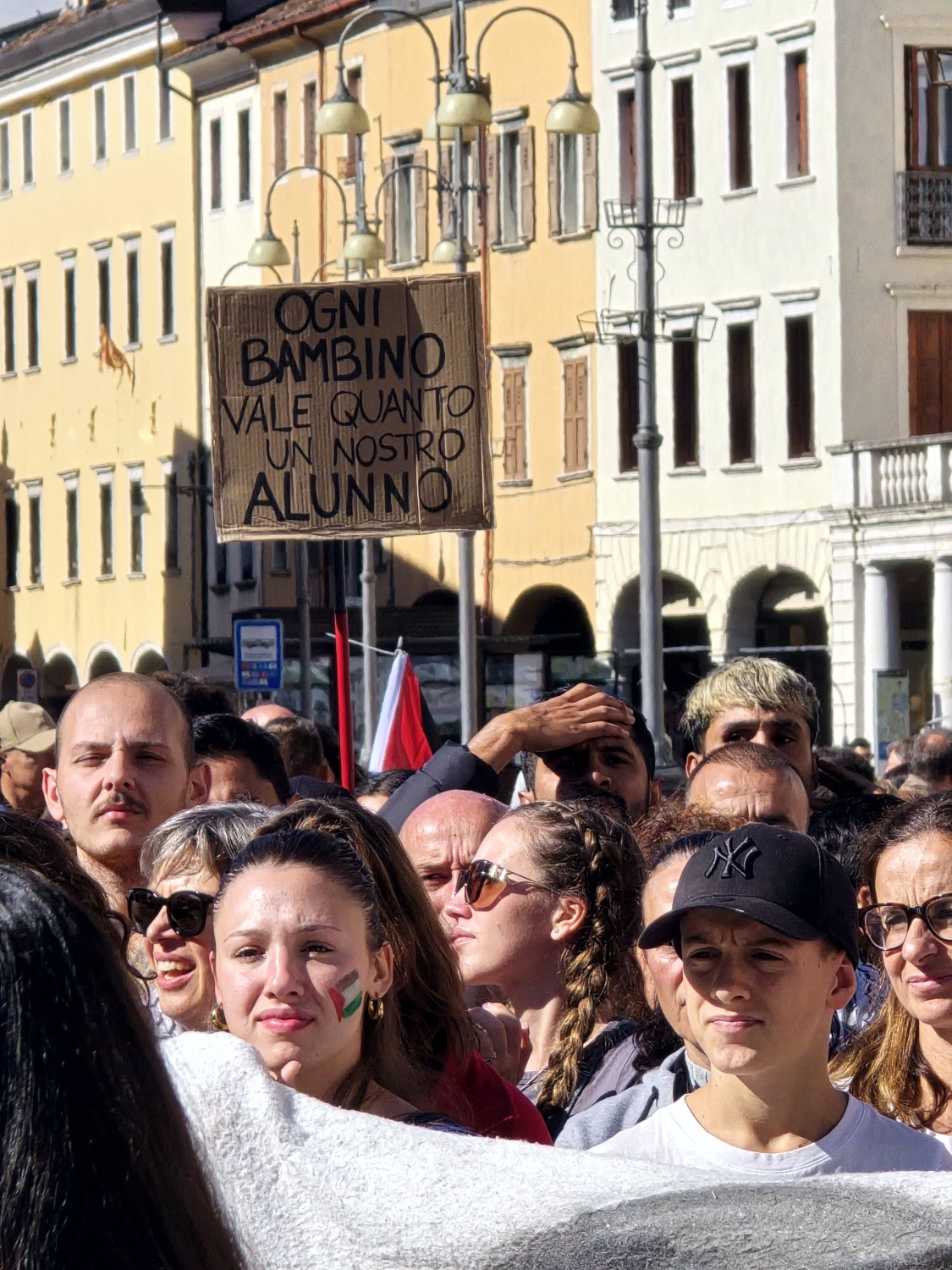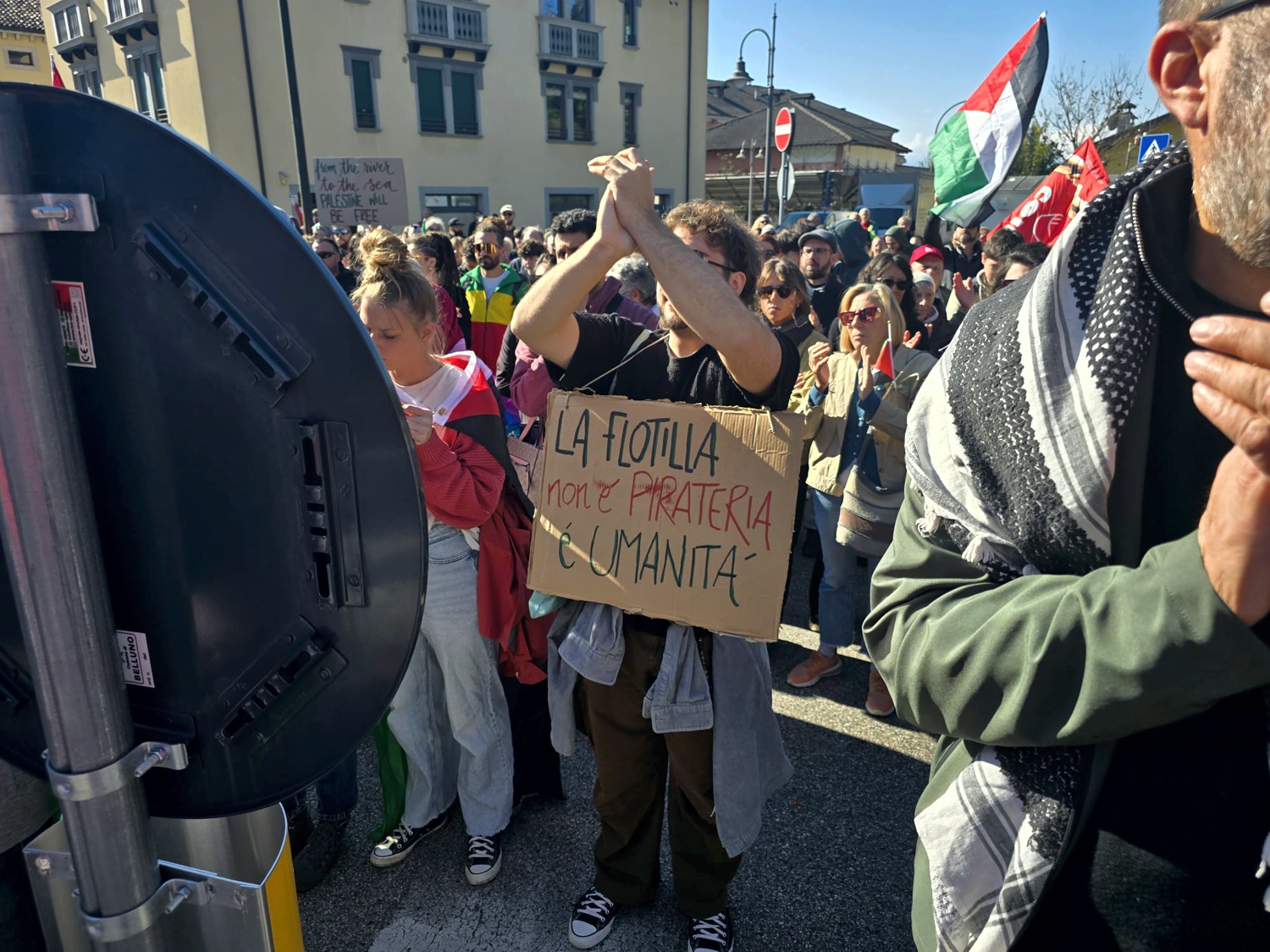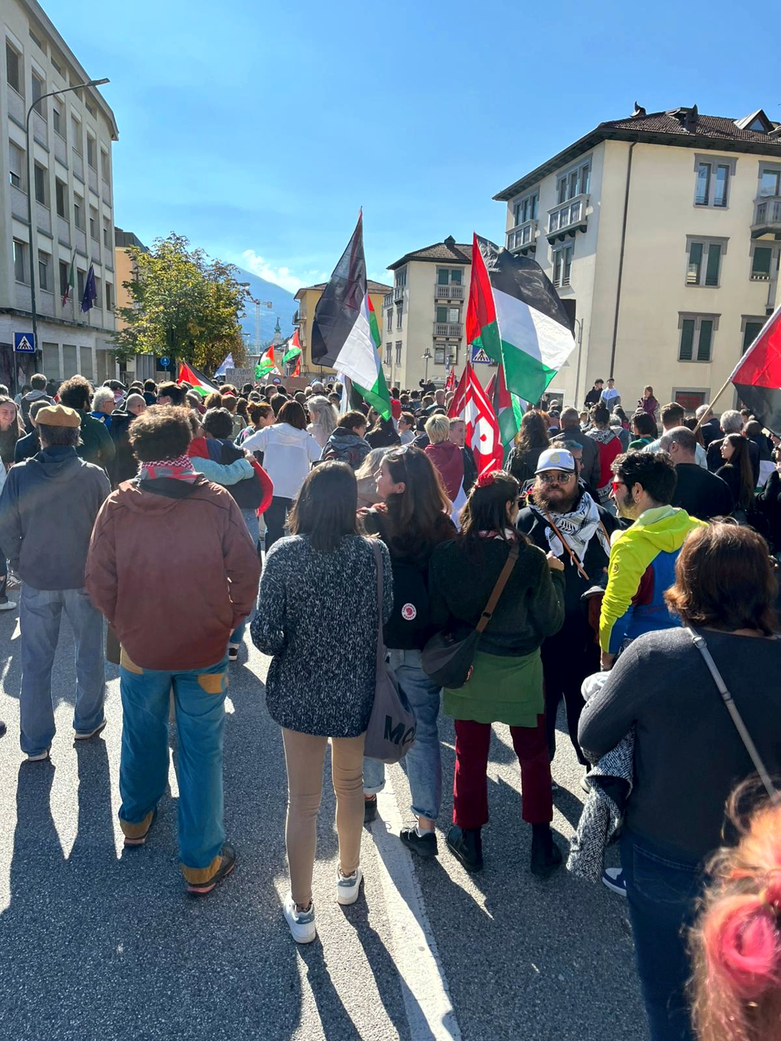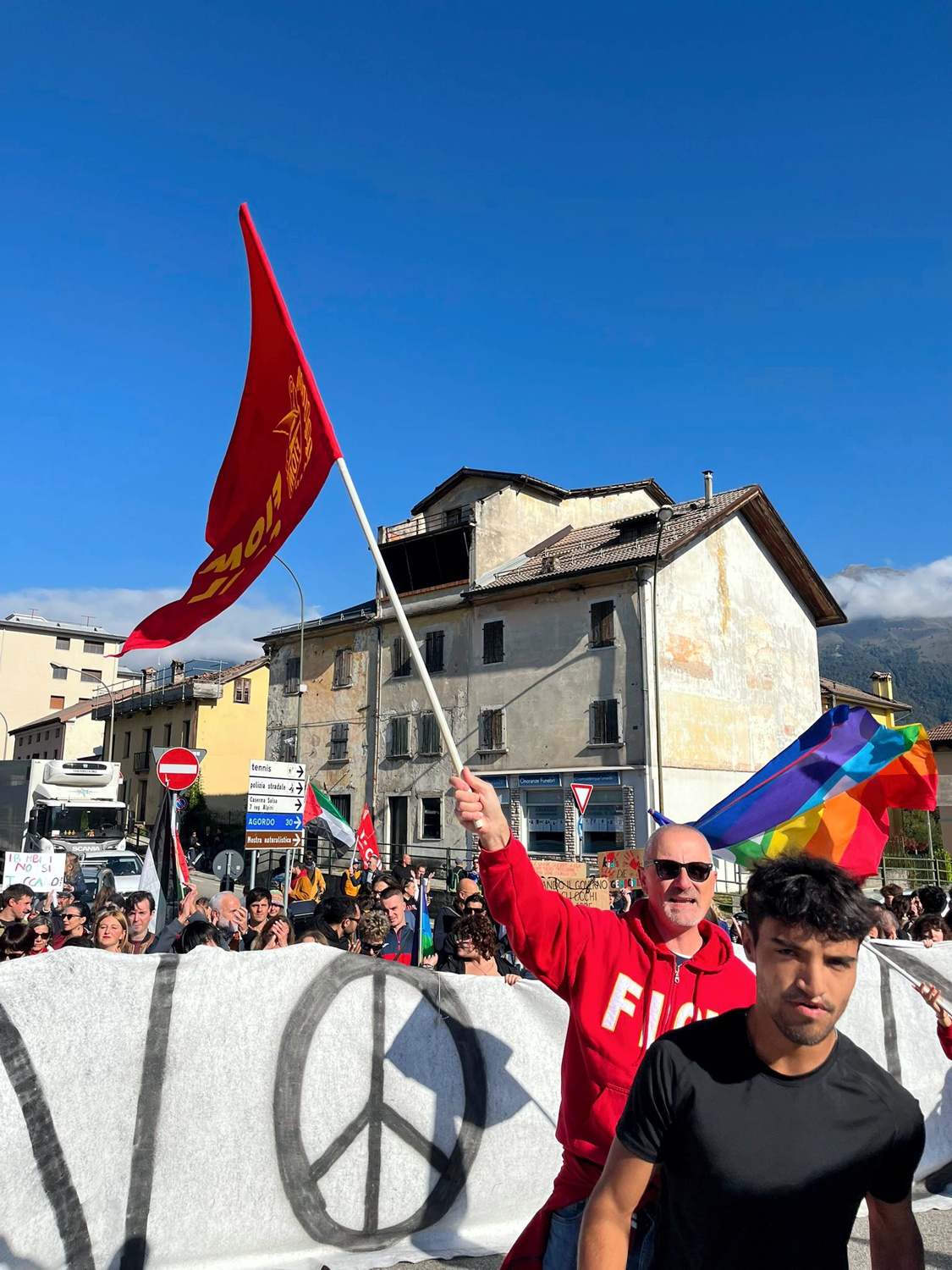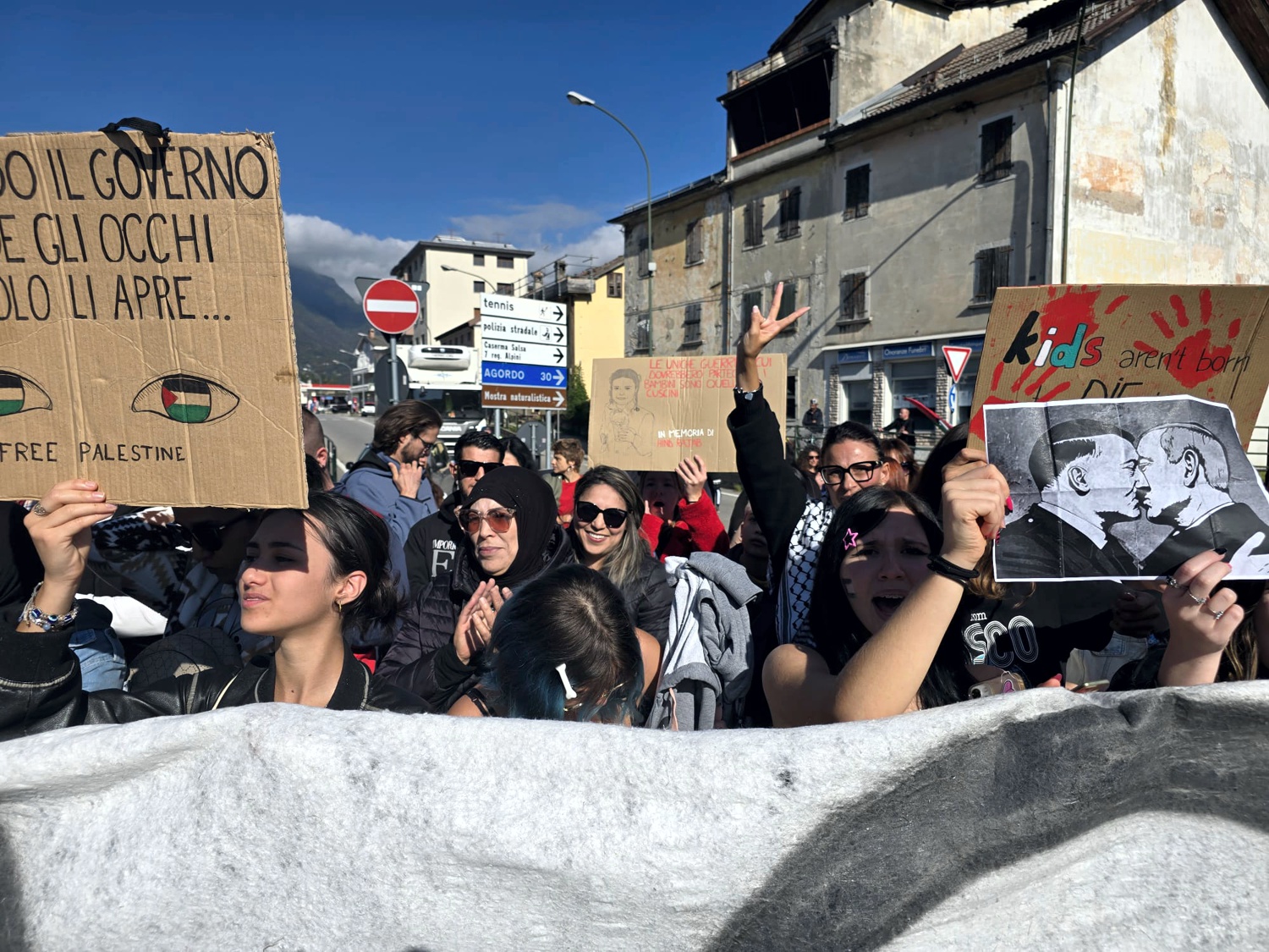 A Belluno almeno duemila persone tra studenti, lavoratori e pensionati hanno marciato per chiedere la pace a Gaza. Una marea di persone che ha riempito tutta Piazza dei Martiri. I manifestanti si sono ritrovati stamattina, venerdì 3 ottobre, alla rotonda della Cerva per partecipare allo sciopero generale indetto da Flc– Cgil e S.i. Cobas in segno di protesta contro il blocco della missione umanitaria della Global Sumund Flotilla per Gaza. L'appuntamento era previsto per le 10 ma molti si sono presentati sul posto prestabilito con minuti di anticipo muniti di cartelli di protesta, bandiere palestinesi e fumogeni. Dalla rotonda della Cerva sono partiti cori pro Palestina, canzoni inneggianti la libertà e invettive contro il governo Meloni, contro il ministro Salvini e contro il governo israeliano. Dal punto di ritrovo i manifestanti si sono avviati verso il centro storico attraversando viale Fantuzzi, proseguendo lungo via Girolamo Segato per poi imboccare via Loreto e giungere nel centro cittadino. Una volta giunto in Piazza dei Martiri, il corteo ha percorso metà Liston prima di depositare a terra una bandiera palestinese e una bandiera della pace. I manifestanti si sono chiusi a cerchio impugnando uno striscione che invocava lo stop al genocidio palestinese ed hanno ascoltato le parole di diversi rappresentanti sindacali, politici ed insegnanti. Gli interventi degli interlocutori venivano spesso interrotti da cori e canti che inneggiavano alla libertà per la Palestina. Il tutto è avvenuto in clima sereno e disteso, dove diversi oratori hanno potuto parlare ed esporre le rispettive motivazioni alla base dell'adesione allo sciopero. Rumori, suoni e colori hanno attirato anche tanti curiosi che, seppur inizialmente non avevano partecipato allo sciopero, hanno iniziato a cantare e ascoltare con interesse le motivazioni e i discorsi pro Gaza dei manifestanti.